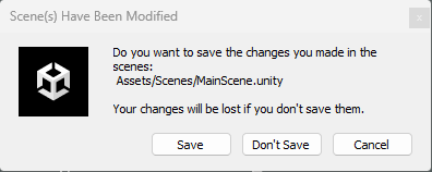 Sceneを離れる時にセーブできていないとこのような警告がでるはずなので、Saveを押してから離れるようにしましょう。