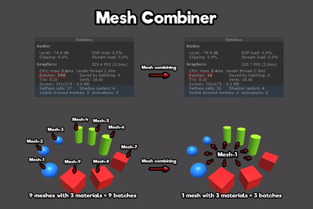 機能としては至ってシンプルですが、メッシュを結合することでバッチ数、ドローコールを減らしゲームを高速・安定化させることができます。