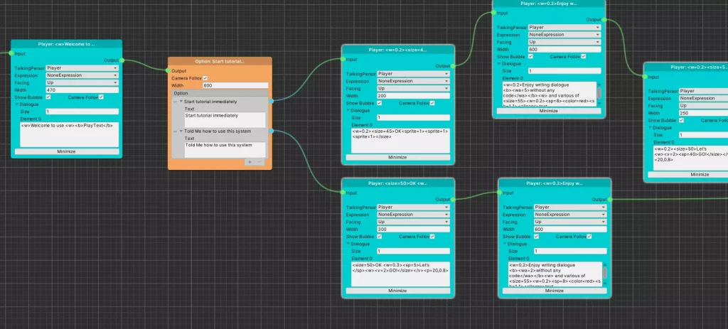 画像のように視覚的、直感的に会話を繋げていく事ができるので、複雑になりがちなノベルゲーム制作を効率的に行えます。
