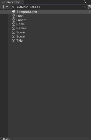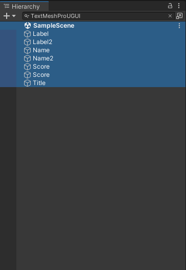ここに「TextMeshProUGUI」と打ち込むと、シーン内のTextMeshProオブジェクトが表示されます。